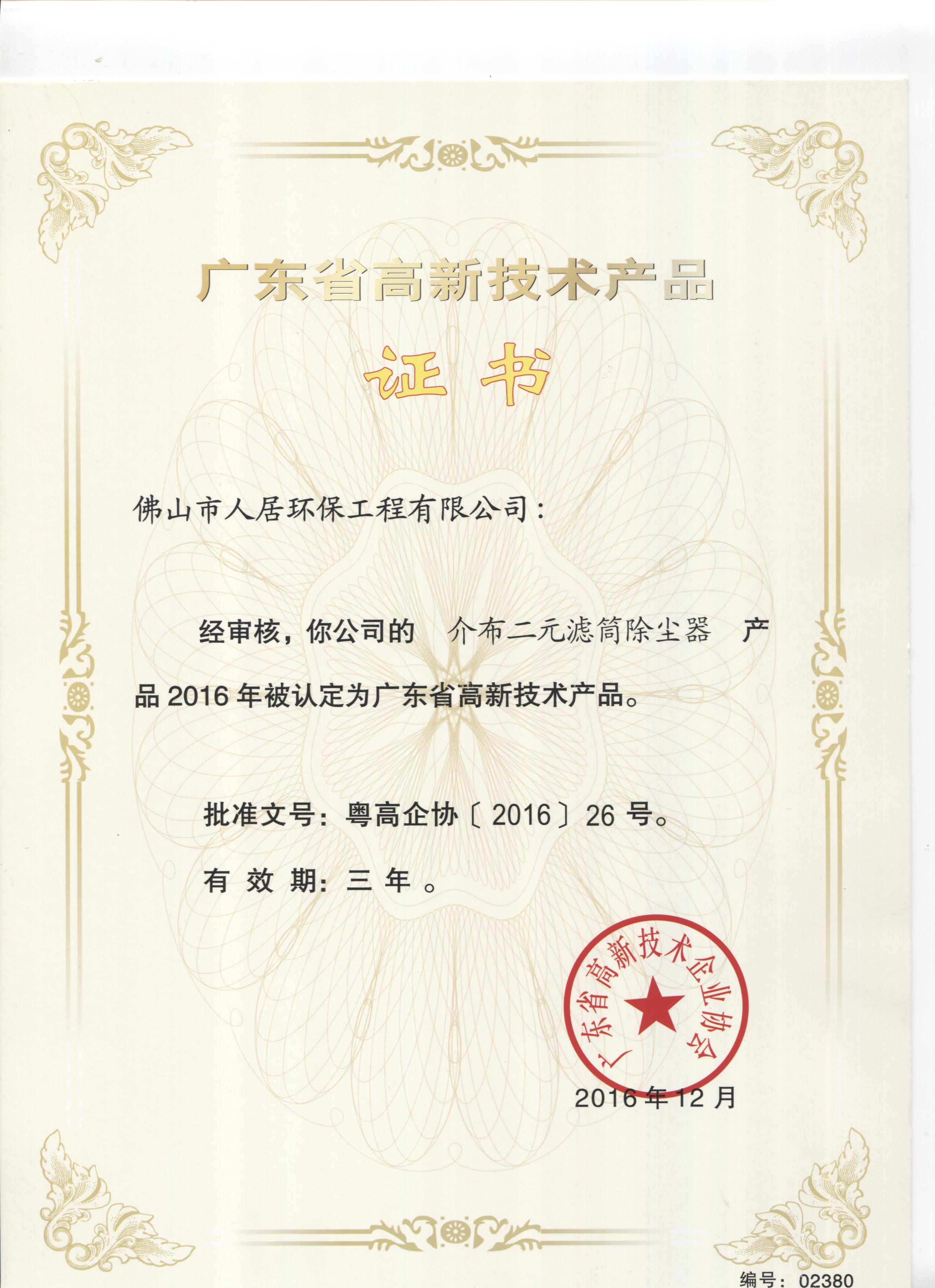 1 、高效除黑油烟尘设备高品证书 2 、介布二元除尘器高品证书
