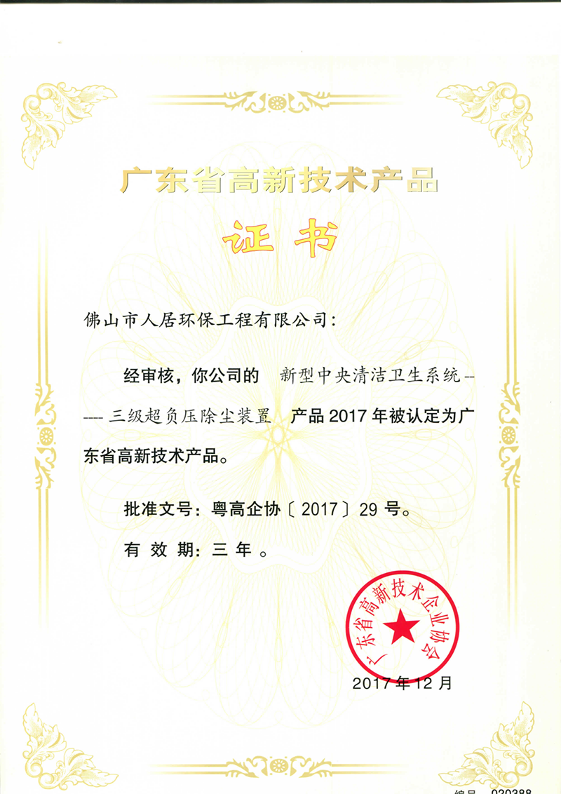 3 、新型中央清洁卫生系统高品证书 4 、均衡三级除尘器